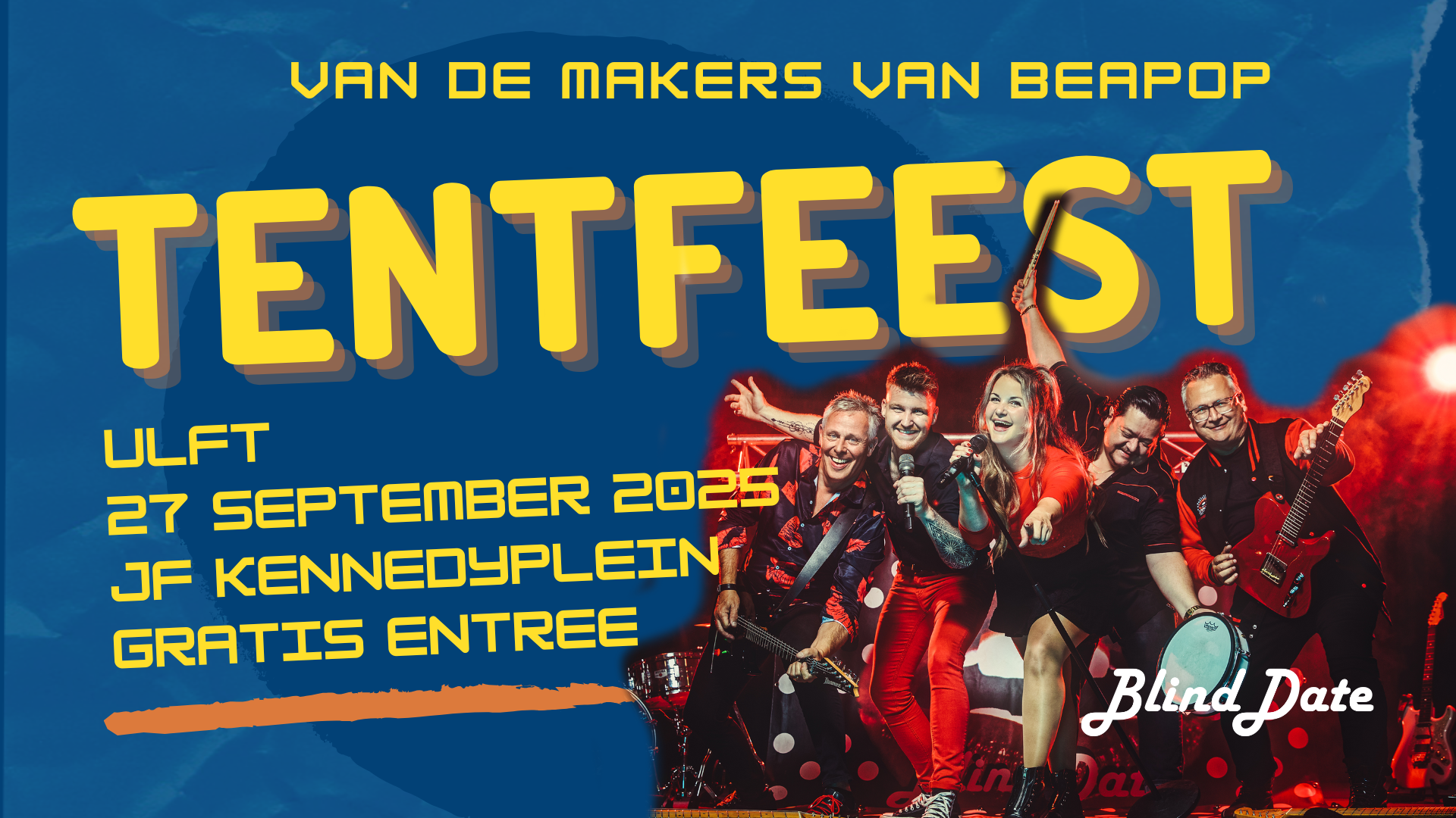 Op zaterdag 27 september knalt het op het Kennedyplein in Ulft! Vanaf 20.00 uur barst het grote Tentfeest los met live muziek van de fantastische band Blind Date. En jawel: de entree is gratis!